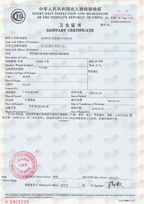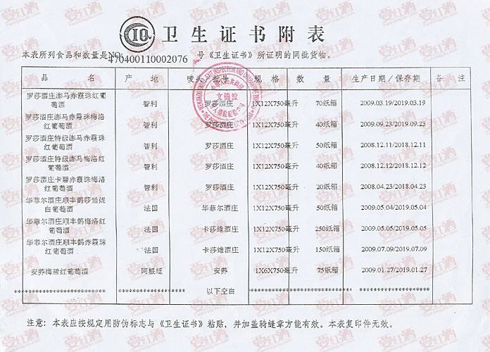 要红酒只出售原瓶纯进口葡萄酒,下面出入境检验检疫证书中可以看到此款佳酿。
