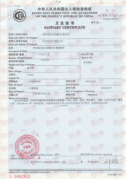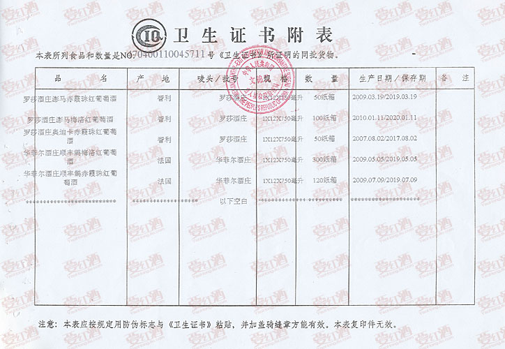 要红酒只出售原瓶纯进口葡萄酒,下面出入境检验检疫证书中可以看到此款佳酿。